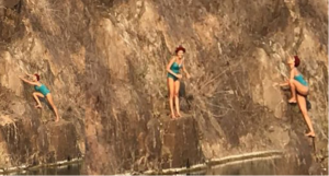 The gorgeous sultry actress is seen in a blue swimsuit, about to take a dive into the water. Another picture shows her climbing the rock nearby.