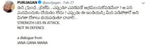 Other day the talented dashing writer-director Puri Jagannath has shared a dialogue from his immaterialized movie, Mahesh Babu’s ‘Jana Gana Mana’, which he announced hastily after Megastar Chiru called-off this 150th film with Puri Jagan. Apparently, his dialogue reads why are various foreigners attacking India all the time, can’t we reach a position where the world lives in a fear of India’s invasion?