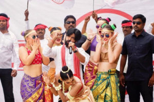 In a picture Varma shared recently, one could notice that a politician is giving his speech and some foreign cheerleaders are dancing around him in some sleazy way. The politician’s white dress with a red towel around the neck, his body langue and hairstyle is mimicking Pawan Kalyan for sure, while the background flex signboard that has a logo which closely resembles in shape and colour to that of Janasena party.